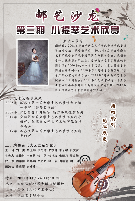 关于举办2017年南京邮电大学邮艺沙龙第三期的通知 讲座主题:小提琴艺术欣赏 主演单位:大艺团弦乐团 主讲人:谢婷婷 时间:2017年11月24日(周五)18:30 地点:仙林校区大学生活动中心三楼团校教室 主办单位:团委(文化艺术中心) 承办单位:学生艺术联合会 欢迎广大师生前来聆听,交流。