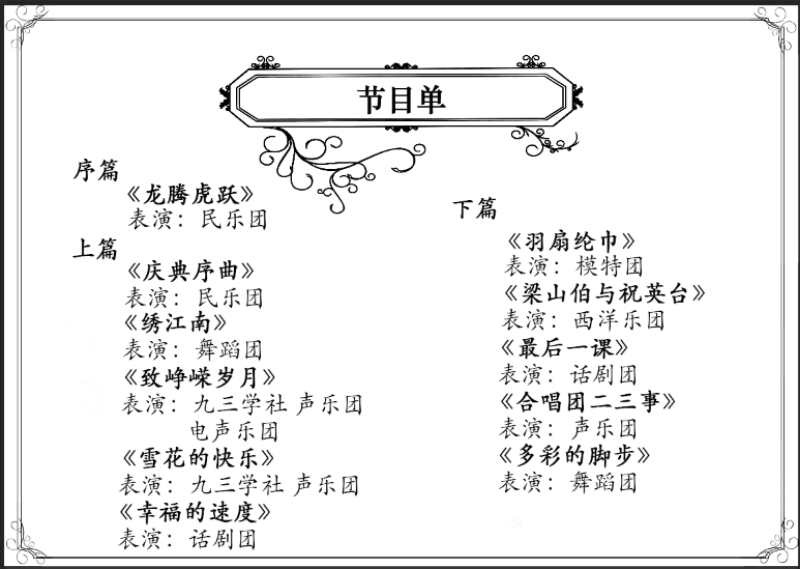 为丰富校园文化生活,营造高雅的艺术氛围,在2018年即将到来之际,由我校“天翼”江苏省大学生艺术团举办的2018新年晚会,将于2017年12月20日(周三)19:00在仙林校区大学生活动中心青春剧场拉开帷幕。现将节目单公布如下: