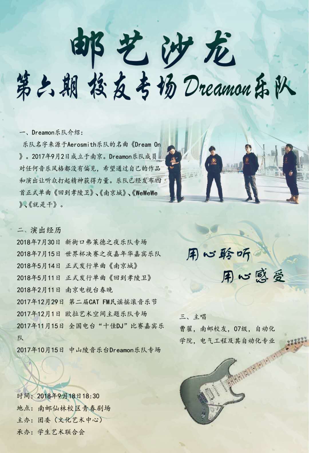 关于举办南京邮电大学邮艺沙龙第六期的通知 讲座主题:校友专场——Dreamon乐队 主讲人:曹翟 时间:2018年9月18日(周二)18:30 地点:南京邮电大学仙林校区青春剧场 主办单位:团委(文化艺术中心) 承办单位:学生艺术联合会