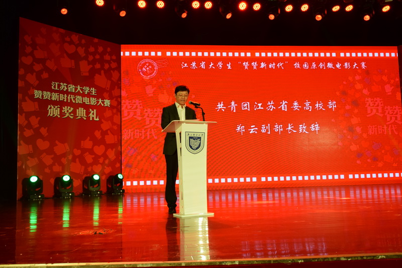 共青团江苏省委高校部副部长郑云致辞。他回顾了第十二届江苏省大学生文化艺术节组织筹备情况,并指出微电影是互联网时代的一种新的艺术形式,深受青年朋友喜爱,要发挥精神文化产品育人化人的重要功能。