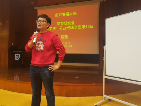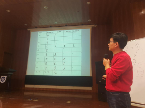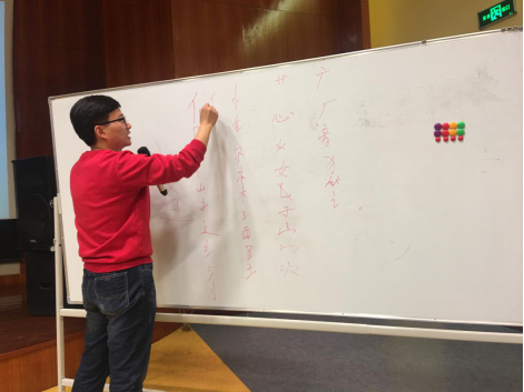 讲座最后,杨龙学长通过分解偏旁部首,传授现场学生们许多草书的写法,还从文字学的角度解释了简体字是由草书演化而来。1954年以后,国家只造出了百分之一的简体字,大部分的简体字出自历朝历代的草书简化。
