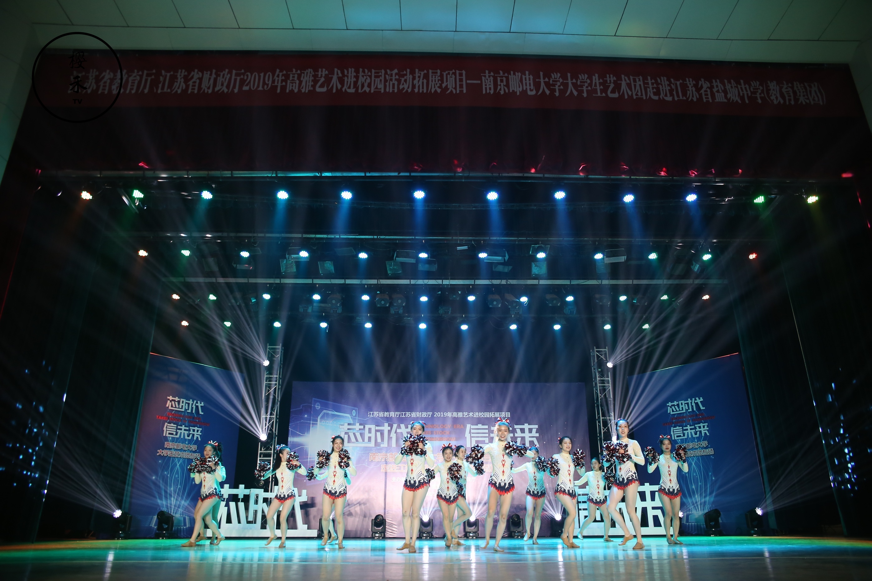正式表演在南京邮电大学原创节目新派龙狮秀《龙腾虎跃》中正式拉开了序幕。此次南京邮电大学大学生艺术团的表演者们为盐城中学的师生们带来了十三个艺术节目包括新派龙狮秀《龙腾虎跃》、舞蹈《键盘上的青春》、二胡齐奏《战马奔腾》、歌舞剧《幸福的速度》、舞蹈《绣江南》、男女对唱《我和我的祖国》、小合唱《树上的星星》、舞蹈《家园往事》、表演唱《声律启蒙》、啦啦操《邮我青春》、小提琴独奏《查尔达什舞曲》、音诗画《芯时代信未来》、歌伴舞《一路有你》。此次“芯时代,信未来”高雅艺术进校园中,节目紧密把握时代脉搏,并将信息特色、科技元素和中华民族的历史观、文化观等中国精神潜移默化的融入文艺作品中。最后,演出在歌伴舞《一路有你》中完美落幕。其中,《邮我青春》的演奏者是盐城中学04级校友,本科和研究生均以第一名的成绩考入南京艺术学院小提琴专业,曾任南京艺术学院交响乐团首席,2011年入职以来,多次指导南邮学子在全省乃至全国艺术展演中荣获佳绩。南邮师生美轮美奂的节目深深吸引着台下观众,表演者们与盐城中学的师生互动频繁,双方展现出深厚的友谊。