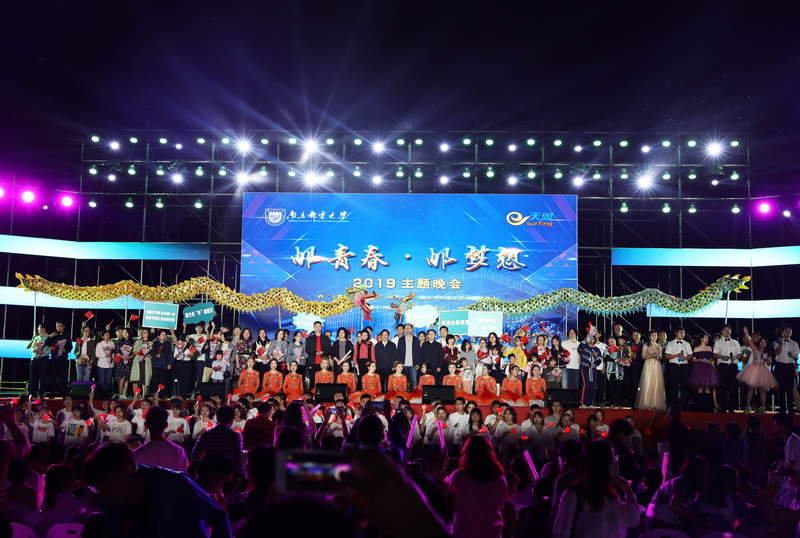5月18日晚,2019“邮青春·邮梦想”主题晚会暨“天翼·飞YOUNG杯”第二十二届大学生文化艺术节闭幕式、第十五届社团巡礼节闭幕式在我校仙林校区南操场举行。校党委书记刘陈,校长叶美兰,校党委副书记、副校长王宗荣,校党委常委、总会计师姜小舜,中国电信南京分公司副总经理王庭文,学校相关职能部门、各学院负责人,学院分团委书记、辅导员、任课老师代表与全校5000多名同学一同观看了演出。