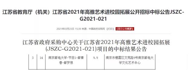 2021年3月23日,江苏省人民政府采购中心公布了2021年江苏省高雅艺术进校园拓展项目中标名单,我校“邮青春,邮梦想”主题晚会首次中标。