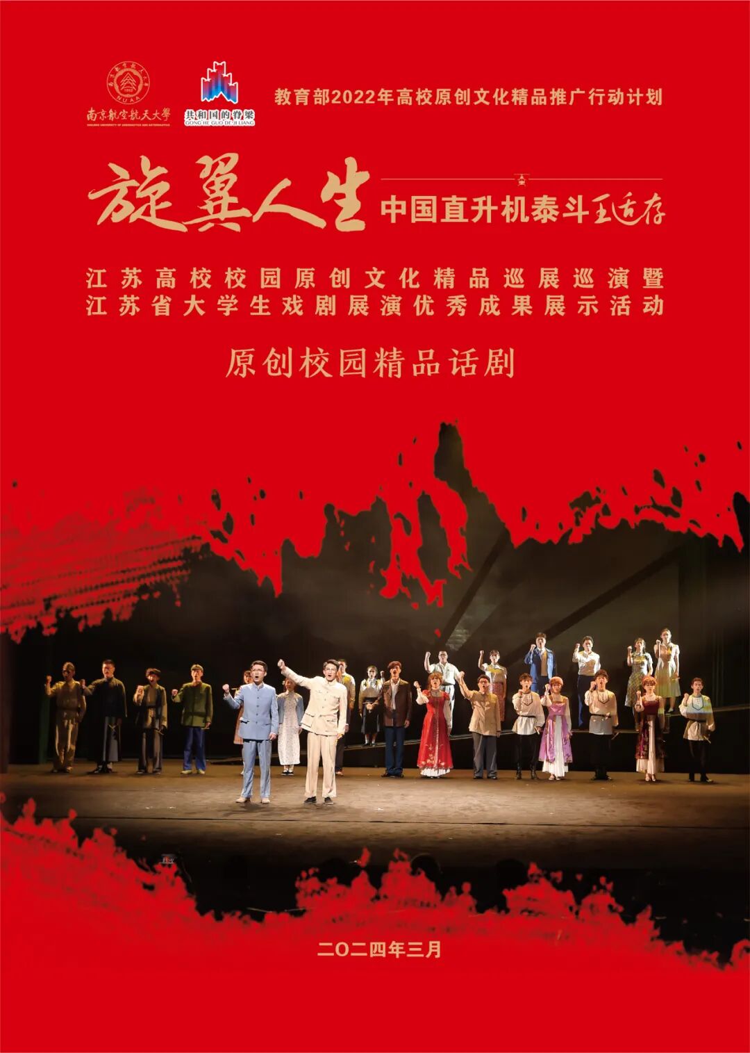 “竹蜻蜓光耀万代,直升机一飞冲天”就在今天,为展示江苏大学生戏剧展演优秀成果,来自南京航空航天大学的优秀原创校园话剧《旋翼人生:中国直升机泰斗王适存》拉开了巡展巡演的帷幕。而本人有幸参与观看,感触颇深。